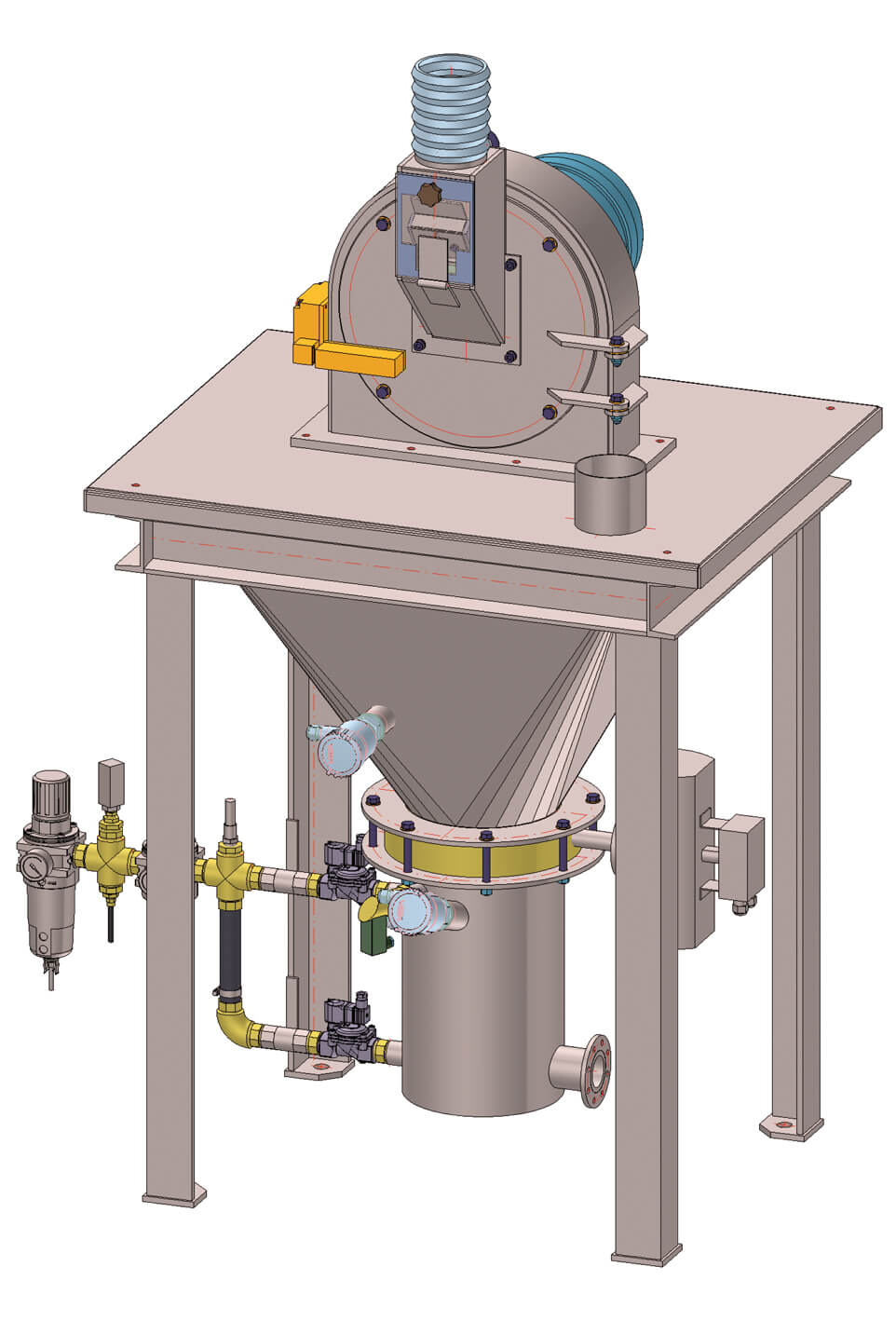 Ein Magnetschalter und eine Motor-Stillstandsüberwachung sichern die Tür gegen unbeabsichtigtes Öffnen. Die Turbomühle ist mit einem Schrägeinlauf und einem schwenkbaren Dauermagneten zur Abscheidung von Metallteilen ausgerüstet.